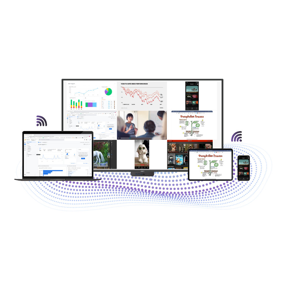 Comparta contenido desde móviles, tablets, portátiles o PC de escritorio y transmítalo a la pantalla interactiva en tiempo real sin cables.